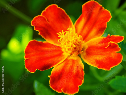 © Deacon docs, Fototapeta premium Marigold flower close up. Bright red petals on a juicy background of green grass. Vivid illustration with contrasting and saturated colors on the theme of summer and bloom. Macro
