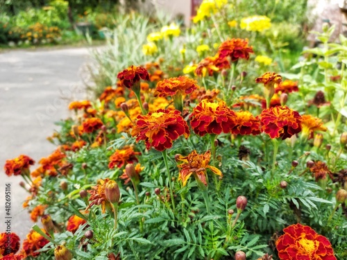 © Lyubov K, Naklejka premium Marigold flowers tagetes patula close up, blurred focus