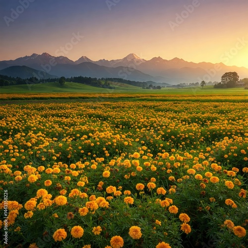 Fototapeta premium Marigold Valley and Snow Mountains at Spring Sunrise – 4K Ultra-HD Wallpaper...