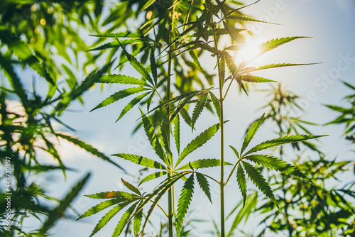 © johnalexandr, Obraz premium Marijuana leaves grow at sunset in summer