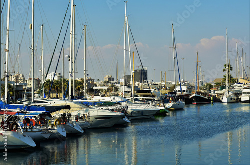 Fototapeta premium Marina bay with moored sailboats, Cyprus.