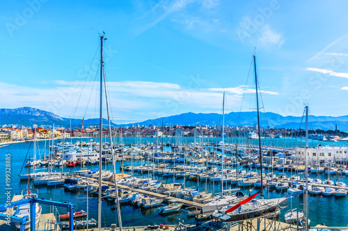 Obraz premium Marina sea port Split. / Scenic view at amazing mediterranean port in coastal town Split, popular summer resort in Croatia, Europe.
