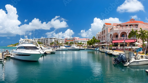 Fototapeta premium Marina with yachts in a Caribbean harbor at midday for travel, tourism, resort ads, or vacation brochures, with a vibrant blue sky