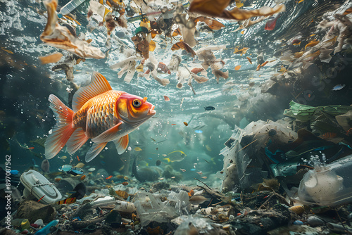 Naklejka premium Marine animals tangled and surrounded by garbage at the bottom of the sea.