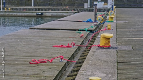 © rohawk, Obraz premium Marine Floating Bridge Platform Moored with Polypropylene Nylon Plastic Rope Around Yellow Metal Bollard Mounted at Harbor Concrete Pier
