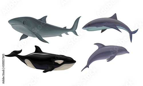 Fototapeta premium Marine Habitant with Dolphin and Shark Vector Set