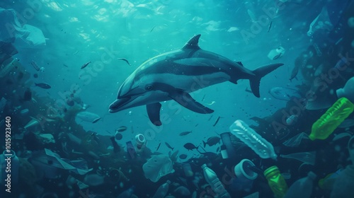 Fototapeta premium Marine Life Among Ocean Pollution and Debris