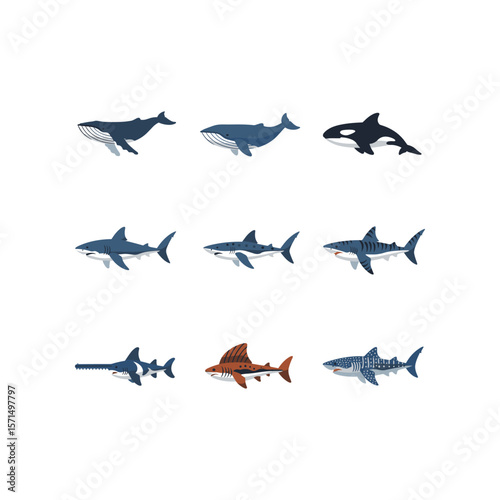 Fototapeta premium Marine Life Collection Whales and Sharks in Flat Illustration Style