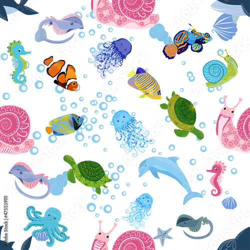 © MichiruKayo, Naklejka premium Marine life, fish, animals bright seamless pattern. sea travel, underwater diving animal tropical fish. Jellyfish, whale, shark, seahorse, clown fish, dolphin, turtle, emperor