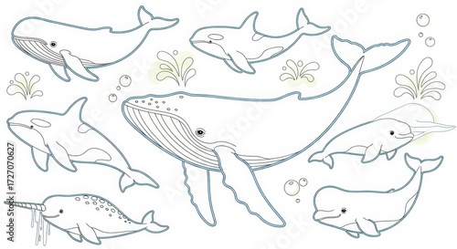 © facegolf, Obraz premium Marine Life Illustration Collection - A collection of line art illustrations of various marine mammals, suitable for coloring or design purposes