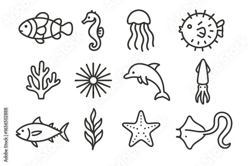 Fototapeta premium Marine life outline icons: fish, seahorse, jellyfish, dolphin, starfish, coral, squid