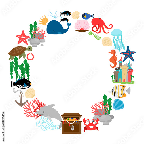 © ssstocker, Obraz premium Marine life round frame with fishes corals and shells. Vector illustration