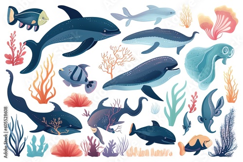 © Afi Kreative, Obraz premium Marine wildlife in blue pastel tone using generative AI