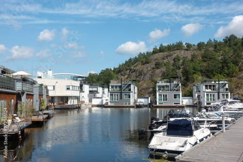Fototapeta premium Marinstaden marina inspired locality in Nacka, Sweden, unique architecture with houses built on the water and boats moored