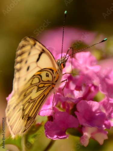 © Adriana, Obraz premium Mariposa amarilla en flor rosa de lantana