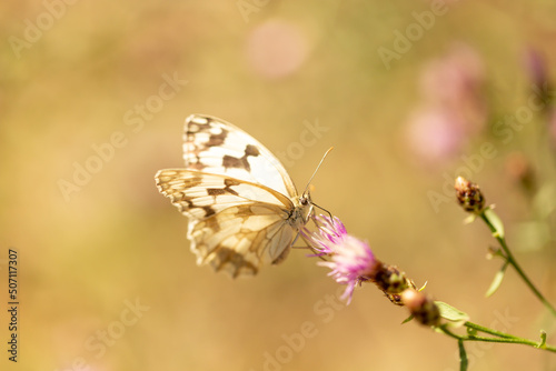 © LeninVladimir, Obraz premium Mariposa posada sobre una flor morada