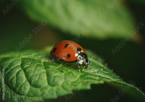 © Davide, Fototapeta premium Mariquita encima de hojas verdes naturaleza