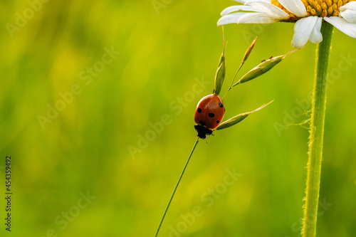 © vir, Naklejka premium Mariquita paseando por una margarita. cocinnella septempuncata. Mariquita de siete puntos. Chrysanthemun leaucanthemum