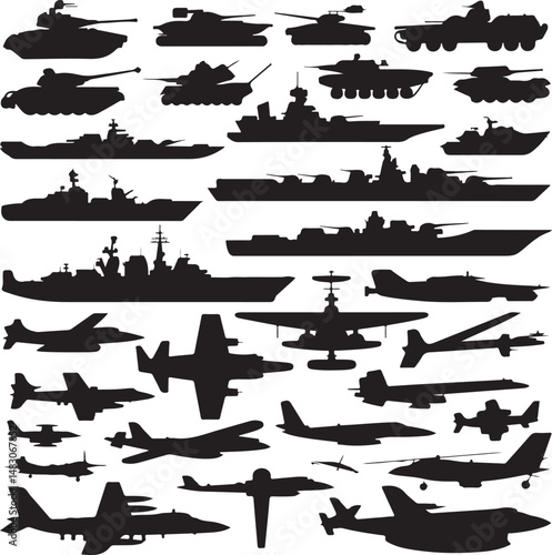 Naklejka premium Maritime Collection: Nine varied vessel silhouettes, each a monochromatic representation of different ships, set against a seamless field. A diverse selection of craft.