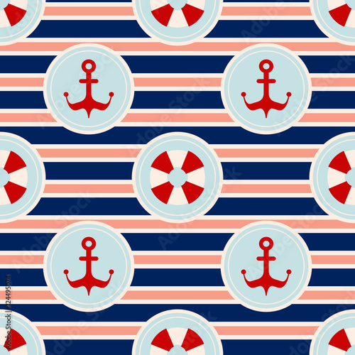 Obraz premium Maritime mood pattern, Seamless nautical pattern with life buoys, anchors and striped background