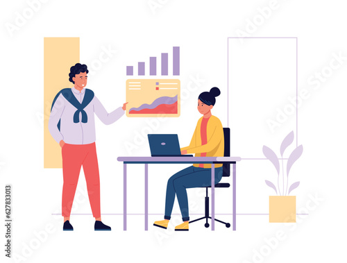 © Tartila, Obraz premium Market analytics. Woman employee sitting at desk with laptop, man worker showing data analytics. Financial management