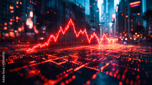 Fototapeta premium Market Crash: A Glowing Red Stock Market Decline Graph Projected Over a Futuristic Cityscape at Night