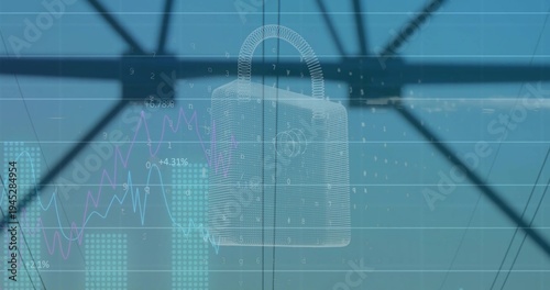 Fototapeta premium Market data updating, causing wireframe padlock hovering over trusses, gridlines, cyan charts