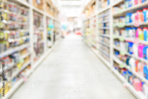 Naklejka premium Market shop, empty supermarket interior with no customers as blurred store...