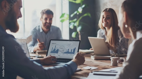 Fototapeta premium Marketing team discussing campaign performance on digital devices in a modern...