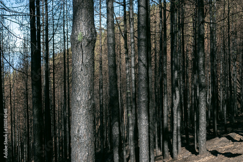 © Ilkka, Obraz premium Marks of wildfire and forest fire on woods in Gran Canaria mountains
