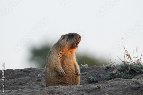 Fototapeta premium Marmota bobak stands on its hind legs near the burrow and screams. It's like he's singing. Beautiful morning light. A life-size portrait of the animal. The background is blurred.
