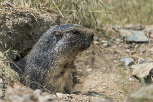 Naklejka premium marmottes (Marmota) devant son terrier.