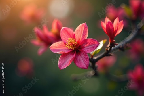 © Maneerat, Fototapeta premium Maroon and yellow tree flower in full bloom on a branch with leaves, bloom, flowers, nature