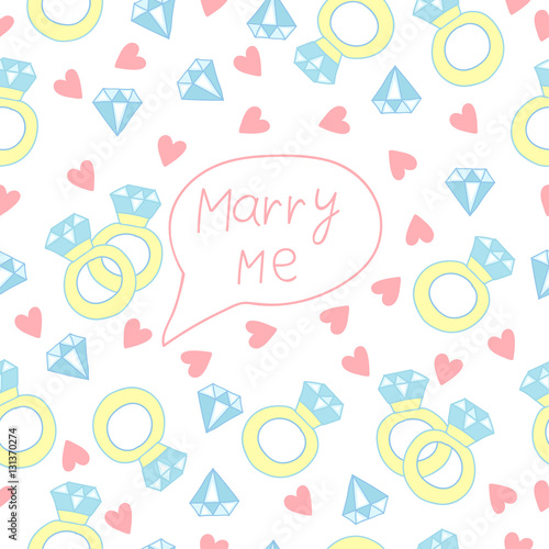 Fototapeta premium Marry me. Wedding seamless pattern with ring, diamond and hearts.