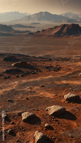Fototapeta premium Mars landscape with rocks and dust, distant mountains.