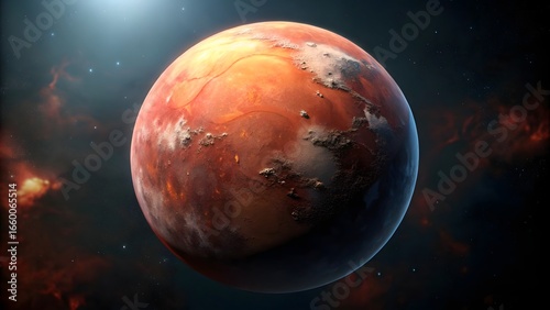 © NoorAfida, Obraz premium Mars The Red Planet in Space with Fiery Nebula and Distant Stars