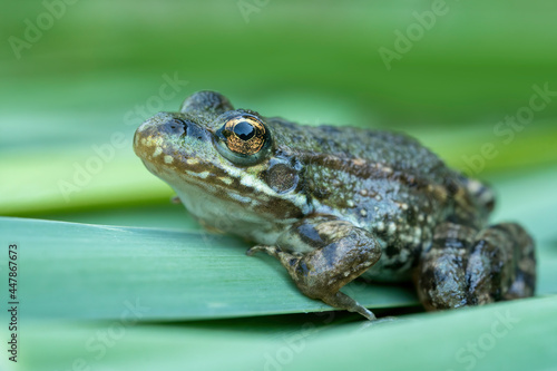 © Kalina, Obraz premium Marsh frog (Pelophylax ridibundus) stands on green reed branches
