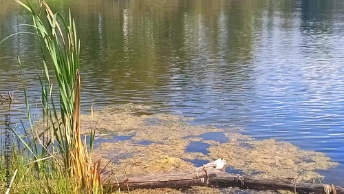 Fototapeta premium Marsh mud and reeds on the shore of a beautiful lake with a shaky surface on...