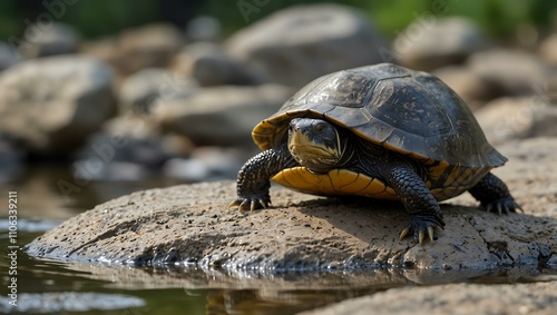 © claudunia, Fototapeta premium Marsh or helmeted turtle sitting on a rock.