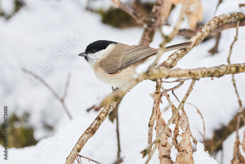 Fototapeta premium Marsh tit bird sitting on a branch in winter season (Poecile palustris)
