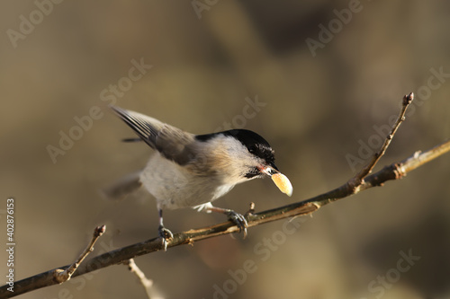 Naklejka premium Marsh tit holds its prey in its beak and sent flying....