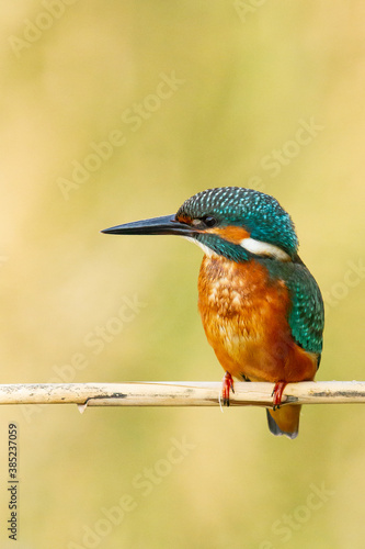 © Carlos, Fototapeta premium Martín pescador (Alcedo atthis), posado sobre el junco con fondo amarillento.