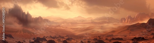 Naklejka premium Martian desert landscape, rocky terrain, thick fog, red-hued sky, distant...
