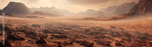 Naklejka premium Martian desert landscape, rocky terrain, thick fog, red-hued sky, distant mountains, hazy atmosphere