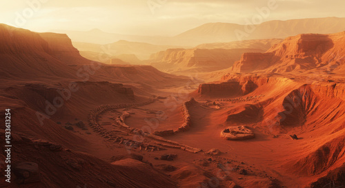 © farazspawn, Fototapeta premium Martian Landscape: Red Desert Terrain and Winding Canyon Under a Golden Sunset