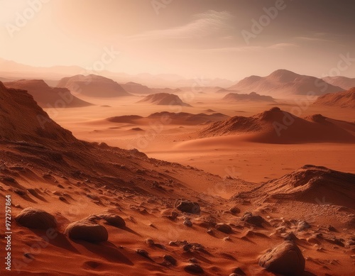 © homan, Naklejka premium Martian landscape with a reddish-brown terrain, scattered rocks and pebbles, undulating sand dunes in the background under a hazy sky