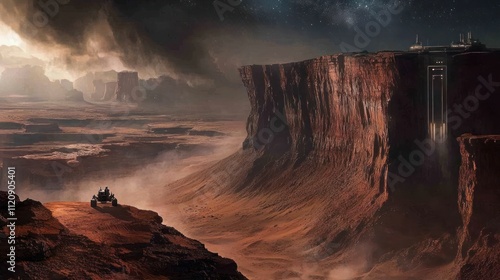 © ichsan, Fototapeta premium Martian Rover Explores Canyon Near Alien Base