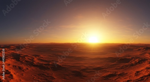 Naklejka premium Martian Sunrise Over Vast Plains - A breathtaking sunrise illuminates the...