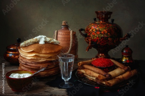 Fototapeta premium Martwa natura z naleśnikami i samowar