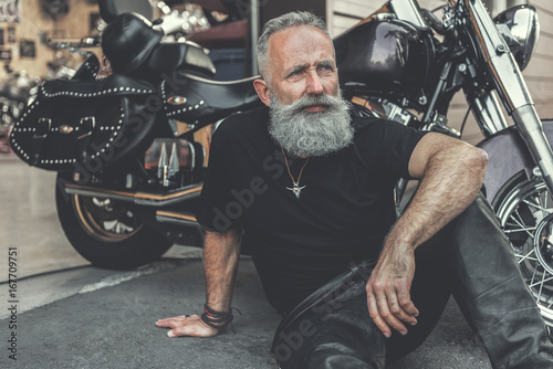 Obraz premium Marzycielski stary człowiek lokalizujący blisko motocyklu
